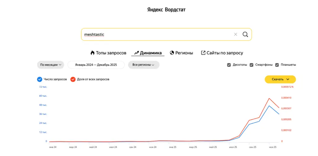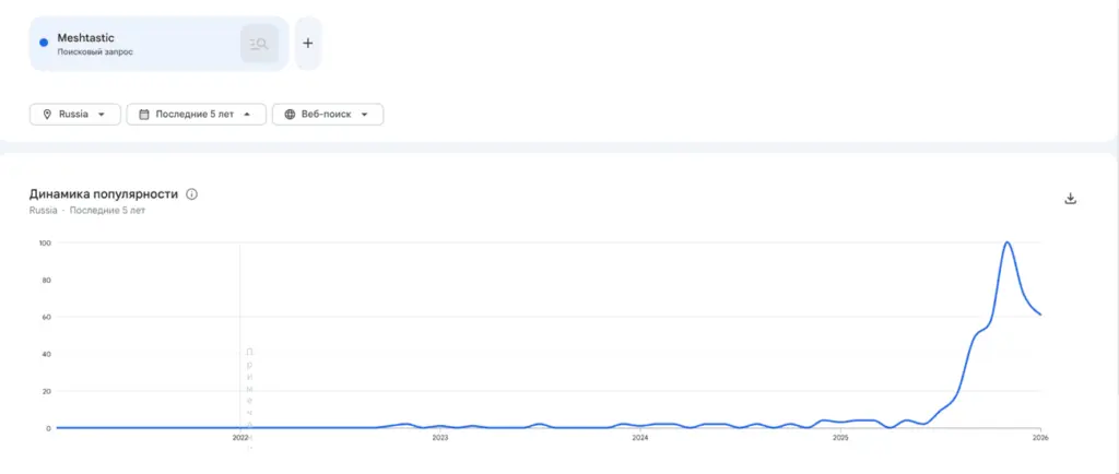 В телеграм-чате Meshtastic Russia количество подписчиков с октября 2025 года увеличилось почти вдвое: с пяти до девяти тысяч. Яндекс ещё в июле 2025 года фиксировал около тысячи запросов «Meshtastic» в месяц, а к ноябрю их ежемесячное число превысило 40 тысяч. Аналогичная динамика по запросу «Meshtastic» с августа наблюдается и в Google.