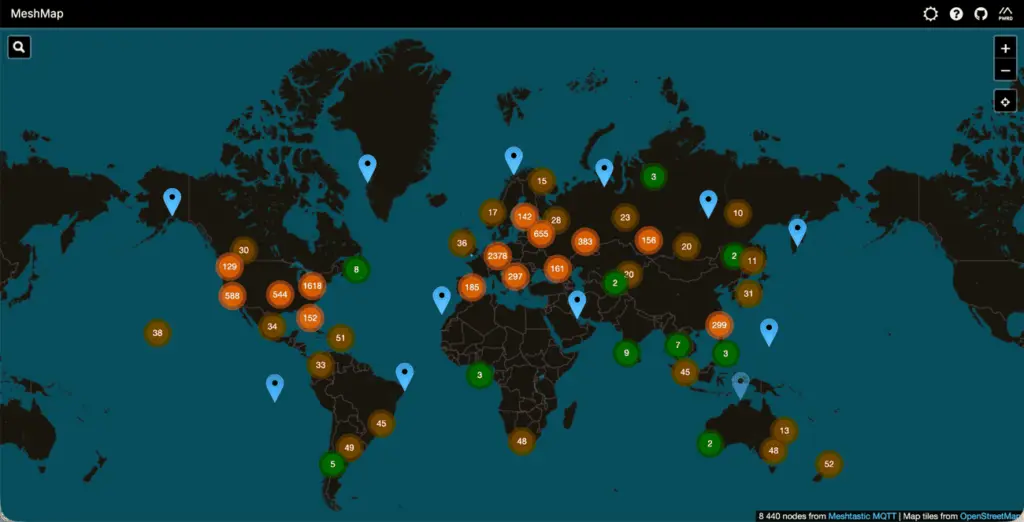 Разумеется, Meshtastic — это не только российский, а вполне международный феномен. На глобальной карте можно увидеть, что нодами покрыты практически все страны, и городов вообще без нод практически нет.